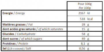 Ingrédients : sucre, beurre de cacao, poudre de LAIT entier, céréales croustillantes 13% (farine de BLE, GLUTEN de BLE, sucre, farine de malt de BLE, poudre à lever : E500(ii), sel), praliné noisette (NOISETTES 50%, sucre, émulsifiant : lécithines (SOJA), arôme naturel de vanille), pâte de cacao, grains d'amandes, de noisettes et de sucre caramélisés (sucre, AMANDES et NOISETTES torréfiées), arômes, cacao maigre en poudre, émulsifiant : lécithines (SOJA), sucre glace (sucre, fécule de pomme de terre), agents d'enrobage : E414 - E904. Chocolat au lait : cacao 33% minimum. Chocolat blanc : beurre de cacao 28% minimum. Traces éventuelles d'oeufs et d'autres fruits à coque. |