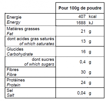 Poudre de cacao pur Ingrédients :Cacao en poudre, correcteur d’acidité : E501.Traces éventuelles de : céréales contenant du gluten, lait, œufs, soja, fruits à coque, céleri et sulfites. |
