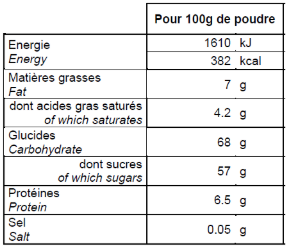 | Ingrédients | Préparation pour boisson cacaotée en poudre - Chocolat en poudre 90% (sucre, cacao 33% minimum), amidon de maïs, épaississant : gomme xanthane, arôme. Traces éventuelles d’autres céréales contenant du gluten, soja, œufs, céleri, sulfites, lait et fruits à coque. |