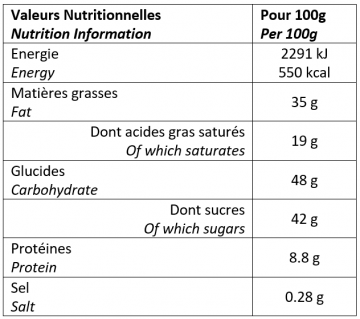 Ingrédients : chocolat blanc arôme café 49% (sucre, beurre de cacao, poudre de LAIT entier, arômes naturels), chocolat au lait 31% (sucre, beurre de cacao, poudre de LAIT entier, pâte de cacao, émulsifiant: lécithines (SOJA), arôme naturel de vanille), céréales croustillantes 18% (farine de BLE, GLUTEN de BLE, sucre, farine de malt de BLE, poudre à lever : ES00(ii), sel), sucre glace (sucre, fécule de pomme de terre). Chocolat au lait : cacao 33% minimum. Chocolat blanc : beurre de cacao 28% minimum. Traces éventuelles de: oeufs, fruits à coque. Croustilles de céréales enrobées de praliné et de chocolat au lait avec praliné grain Ingrédients : chocolat au lait 64% (sucre, beurre de cacao, poudre de LAIT entier, pâte de cacao, émulsifiant : lécithines (SOJA), céréales croustillantes 15% (farine de BLE, GLUTEN DE BLE, sucre, farine de malt de BLE, poudre à lever : ES00(ii), sel), arôme naturel de vanille), praline noisette 12% (NOISETTES 50%, sucre, émulsifiant : lécithines (SOJA), arôme naturel de vanille), praliné grain 6,5% (sucre, AMANDES et NOISETTES torréfiées), beurre de cacao, agents d'enrobage : E414-E904. Chocolat au lait: cacao 33% minimum. Traces éventuelles de : oeufs, autres fruits à coque. Amandes enrobées de chocolat au lait Ingrédients : chocolat au lait 67% (sucre, beurre de cacao, poudre de LAIT entier, pâte de cacao, émulsifiant : lécithines (SOJA), arôme naturel de vanille), AMANDES torréfiées 30%, cacao maigre en poudre. Chocolat au lait : cacao 33% minimum. Traces éventuelles de céréales contenant du gluten, oeufs, autres fruits à coque. Carrés de chocolat au lait aux éclats de caramel Ingrédients : sucre, beurre de cacao, poudre de LAIT entier, pâte de cacao, éclats de caramel 10% (sucre, sirop de glucose, CREME fraîche, BEURRE demi-sel AOP d'lsigny 4,1%, poudre de LAIT écrémé, fleur de sel de Guérande IGP 1,6%), émulsifiant : lécithines (SOJA), arôme naturel de vanille. Chocolat au lait: cacao 33% minimum. Traces éventuelles d'oeufs, céréales contenant du gluten et fruits à coque. Carrés de chocolat noir aux brisures de nougat Ingrédients : pâte de cacao, sucre, brisures de nougat 9,0% (AMANDES, sucre, sirop de glucose, miel, beurre de cacao, pain azyme (fécule, pomme de terre, eau), blanc d'OEUF, arôme naturel de vanille), émulsifiants : lécithines (SOJA) - E476. Chocolat noir : cacao 70% minimum. Traces éventuelles de céréales contenant du gluten, lait, autres fruits à coque. |