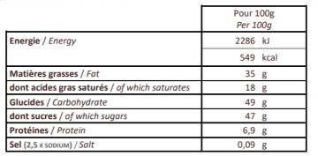 Ingrédients : sucre, pâte de cacao, praliné noisette 22% (NOISETTES 50%, sucre, émulsifiant : lécithines (SOJA), arôme naturel de vanille), beurre de cacao, poudre de LAIT entier, brisures de crêpe croustillante 2.0% (farine de BLE, sucre, BEURRE concentré, LAIT écrémé en poudre, malt d'ORGE, sel), émulsifiant : lécithines (SOJA), arôme naturel de vanille. Chocolat au lait : cacao 33% minimum. Chocolat noir : cacao 65% minimum |