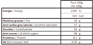 Ingrédients : chocolat blanc arôme café 49% (sucre, beurre de cacao, poudre de LAIT entier, émulsifiant : lécithines (SOJA), arômes naturels), chocolat au lait 31% (sucre, beurre de cacao, poudre de LAIT entier, pâte de cacao, émulsifiant : lécithines (SOJA), arôme naturel de vanille), céréales croustillantes 18% (farine de BLE, GLUTEN de BLE, sucre, farine de malt de BLE, poudre à lever : E500(ii), sel), sucre glace (sucre, fécule de pomme de terre). Chocolat au lait : cacao 33% minimum. Chocolat blanc : beurre cacao 28% minimum. Traces éventuelles de : œufs, fruits à coque. |