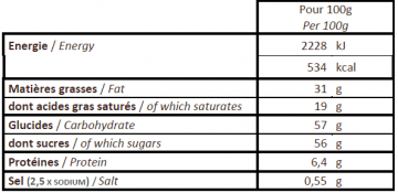 Ingrédients : sucre, beurre de cacao, poudre de LAIT entier, pâte de cacao, sel de Guérande IGP 0,5%, émulsifiant : lécithines (SOJA), arôme naturel de vanille. Chocolat au lait : cacao 33% minimum. Traces éventuelles d'œufs, fruits à coque, céréales contenant du gluten. |