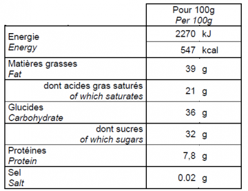 Tablette de chocolat noir aux amandes, aux noisettes et aux raisins Ingrédients : pâte de cacao, sucre, raisins 8,5% (raisins, huile de coton), beurre de cacao, noisette caramélisée 5,7% (NOISETTE, sucre, sirop de glucose, miel), amande caramélisée 5,7% (AMANDE, sucre, sirop de glucose, miel), émulsifiant : lécithines (SOJA). Chocolat noir : cacao 65% minimum. Traces éventuelles d'œufs, d'autres fruits à coque, lait et de céréales contenant du gluten. |