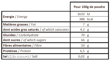 Chocolat en poudre aux épices Ingrédients : sucre, cacao en poudre (32% minimum), épices 0,8% (poivre noir, muscade, girofle, gingembre, cannelle (sulfites)). Traces éventuelles de : céréales contenant du gluten, soja, oeufs, céleri, lait et fruits à coque. |