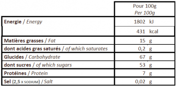 NOUGATS PATRIMOINE Ingrédients : Sucre de canne (origine non UE), AMANDES (28% - origine Espagne), sirop de glucose, miel de lavande maritime, blancs d'OEUFS, PISTACHES (2%), pain azyme (fécule de pomme de terre, eau, huile de tournesol), arôme naturel de vanille. Traces éventuelles de fruits à coques, soja, céréales contenant du gluten et lait. |