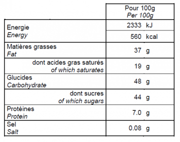 Bonbons de chocolat au lait fourrés au praliné noisettes et éclats de crêpes croustillantes Ingrédients : sucre, praliné noisettes 22% (NOISETTES 50%, sucre, émulsifiant : lécithines (SOJA), arôme naturel de vanille), beurre de cacao, poudre de LAIT entier, pâte de cacao, brisures de crêpes croustillantes 2,0% (farine de BLE, sucre, BEURRE concentré, LAIT écrémé en poudre, malt d'ORGE, sel), émulsifiant : lécithines (SOJA), arôme naturel de vanille. Chocolat au lait : cacao 33% minimum. Traces éventuelles d'oeufs et autres fruits à coque. Bonbons de chocolat noir fourrés au praliné noisettes et éclats de fèves de cacao Ingrédients : pâte de cacao, sucre, praliné noisettes 22% (NOISETTES 50%, sucre, émulsifiant : lécithines (SOJA), arôme naturel de vanille), beurre de cacao, poudre de LAIT entier, éclats de fèves de cacao 2,0%, émulsifiant : lécithines (SOJA), arôme naturel de vanille. Chocolat noir : cacao 65% minimum. Chocolat au lait : cacao 33% minimum. Traces éventuelles d'oeufs et autres fruits à coque. |