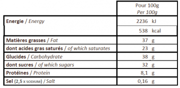 Ingrédients : pâte de cacao, sucre, beurre de cacao, céréales croustillantes (farine de BLE, GLUTEN de BLE, sucre, farine de malt de BLE, poudre à lever : E500(ii), sel), poudre de LAIT entier, émulsifiants : lécithines (SOJA)-E476, agents d'enrobage : E414-E904, arôme naturel de vanille. Chocolat noir origine Ghana : cacao 70% minimum. Chocolat au lait : cacao 33% minimum. Traces éventuelles d'oeufs, fruits à coque. |
