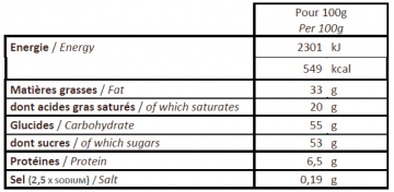 Sucette au chocolat au lait et aux dragées au chocolat colorées aux extraits de plantes Ingrédients : chocolat au lait 86% (sucre, beurre de cacao, poudre de LAIT entier, pâte de cacao, émulsifiant : lécithines (SOJA), arôme naturel de vanille), dragées au chocolat colorées aux extraits de plantes 14% [sucre, beurre de cacao, LACTOSERUM en poudre, cacao maigre en poudre, amidon de riz, poudre de LAIT entier, émulsifiant : lécithines de tournesol, agents d'enrobage (gomme arabique, cire de carnauba, cire d'abeille, shellac), extraits de plantes : Jus concentré de raisin, radis, cassis, citron; extrait de carthame, malt d’ORGE, spiruline]. Traces éventuelles d'arachides, de fruits à coque et d'oeufs. Chocolat au lait : cacao 33% minimum. |