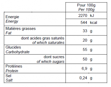 Ingrédients : sucre, beurre de cacao, poudre de LAIT entier, pâte de cacao, brisures de crêpes croustillantes 3,5% (farine de BLE, sucre, BEURRE concentré, LAIT écrémé en poudre, malt d'ORGE, sel), céréales croustillantes 2,8% (farine de riz, sucre, sel, beurre de cacao), émulsifiant : lécithines (SOJA), arôme naturel de vanille. chocolat au lait : cacao 33% minimum. Traces éventuelles d'oeufs et fruits à coque |