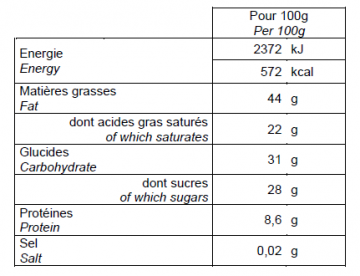 Tablette de chocolat noir aux noisettes caramélisées et pistaches hachées Ingrédients : pâte de cacao, sucre, noisettes caramélisées 14% (NOISETTE, sucre, sirop de glucose, miel), beurre de cacao, PISTACHES hachées 3,5%, émulsifiant : lécithines (SOJA). Chocolat noir : cacao 65% minimum. Traces éventuelles d’autres fruits à coque, d'œufs, de lait et de céréales contenant du gluten. |